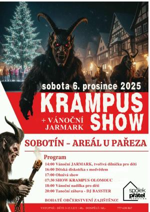 Spolek přátel Sobotína zve všechny na Krampus show + Vánoční jarmark, který se koná v sobotu 6. prosince 2025. Čeká vás pestrý program, včetně tvořivé dílničky a ohnivých atrakcí. Nezapomeňte si užít zábavu s DJ a ochutnat skvělé občerstvení.