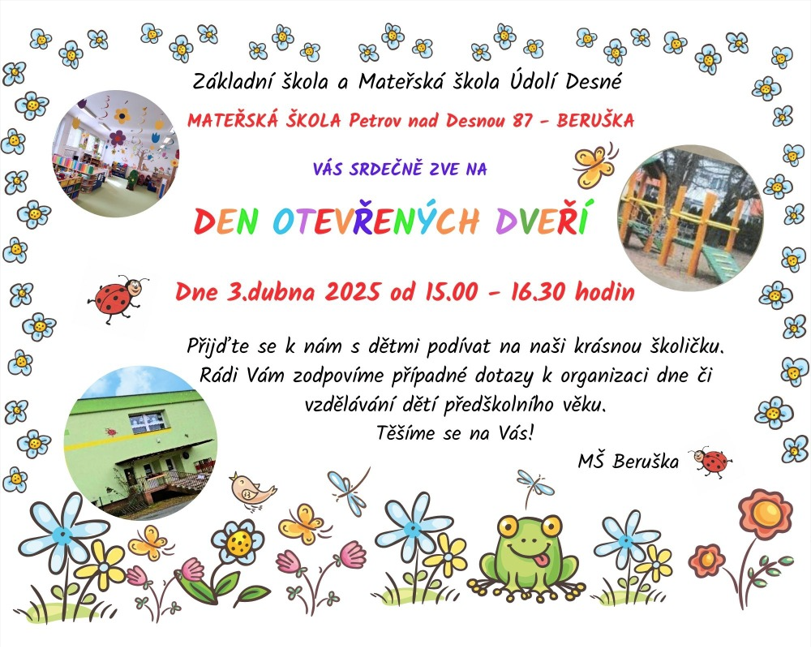 MŠ Beruška Petrov nad Desnou pořádá Den otevřených dveří 3.4.2025 15:00 - 16:30 hod.