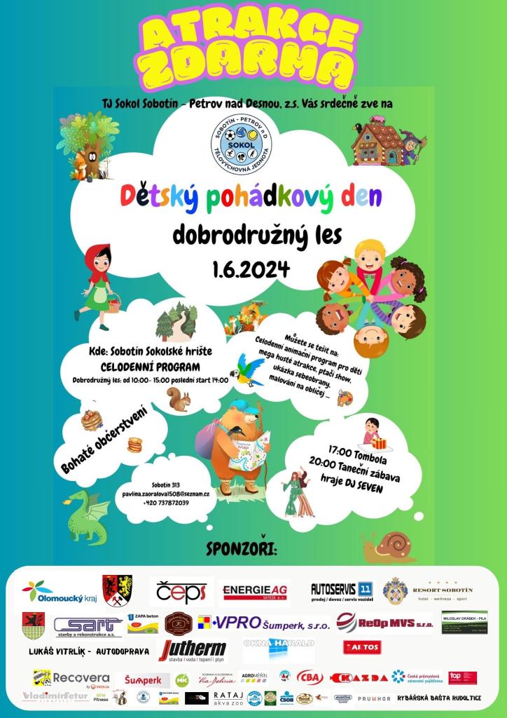 TJ Sokol Sobotín - Petrov nad Desnou, z.s. Vás srdečně zve na "Dětský pohádkový den - dobrodružný les" 1.6.2024 od 10:00 hod. na Sokolském hřišti.