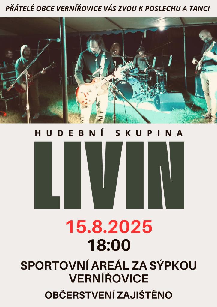 Přijďte se pobavit s hudební skupinou LIVIN, v pátek 15.8.2025 od 18:00 hod, víceúčelový areál za sýpkou.