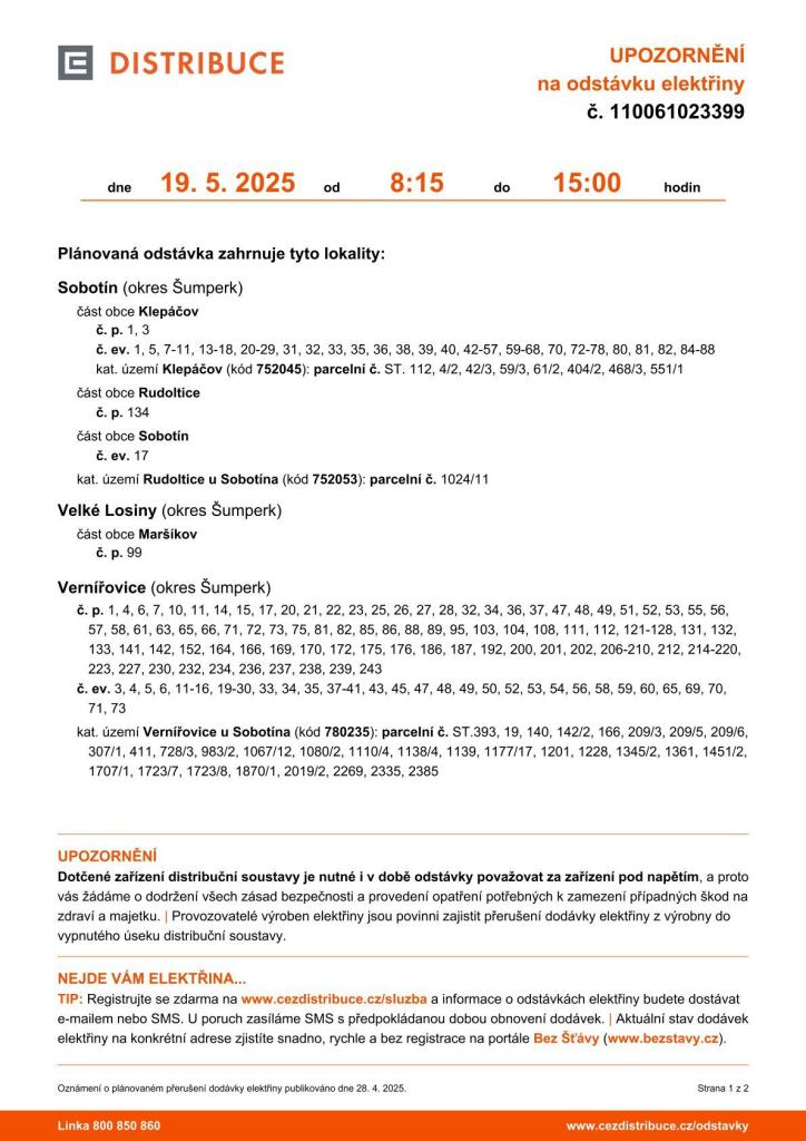 > informace k odstávkám el. energie si může zákazník ke svému odběrnému místu sjednat na stránkách: www.cezdistribuce.cz/odstavky; www.cezdistribuce.cz/sluzba