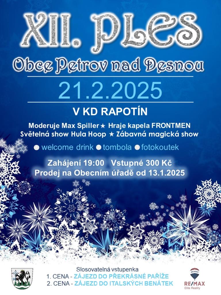 Obec Petrov nad Desnou pořádá XII. ples, 21.2.2025 v KD Rapotín.