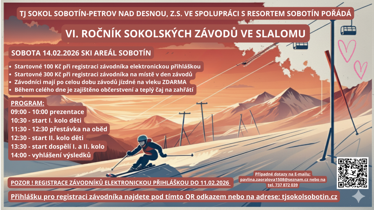 TJ Sokol Sobotín-Petrov nad Desnou ve spolupráci s resortem Sobotín pořádá VI. ročník sokolských závodů ve slalomu. Akce se uskuteční v sobotu 14. února 2026 ve ski areálu Sobotín. Prezentace závodníků proběhne od 09:00 do 10:00, následovat bude I. kolo pro mladé závodníky a po obědové přestávce se uskuteční závody pro dospělé. Závodníci mají po celou dobu závodů jízdné na vleku zdarma. Důležité je, že registrace závodníků elektronickou přihláškou je otevřena do 11. února 2026.