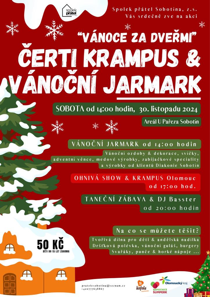 Spolek přátel Sobotína pořádá akci v sobotu 30.11.2024 od 14:00 hod. Můžete se těšit na vánoční jarmark, tvořivou dílnu pro děti a ČERTY KRAMPUS S OHNIVOU SHOUW.